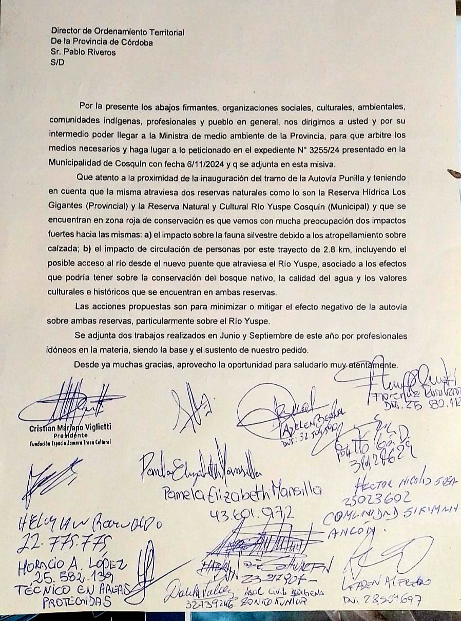 Un petitorio con casi 2.000 firmas, entre manuscritas y digitales, fue presentado al Ministerio de Ambiente de Córdoba para exigir medidas concretas que minimicen el impacto ambiental de la nueva ruta sobre estas áreas protegidas.