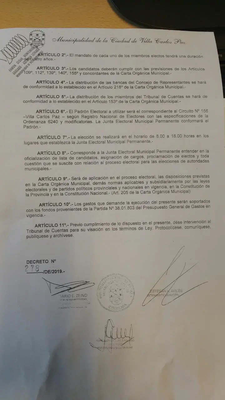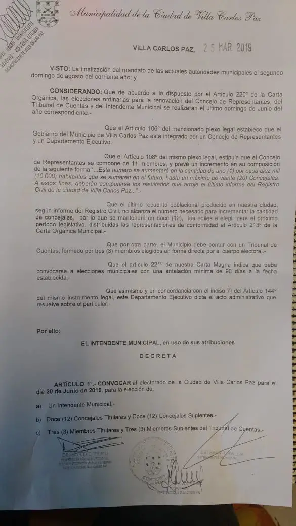 Intendencia 2019. El intendente Esteban Avilés firmó este lunes el decreto de convocatoria a elecciones municipales para el próximo 30 de junio y llamó a la conformación de la Junta Electoral Permanente.