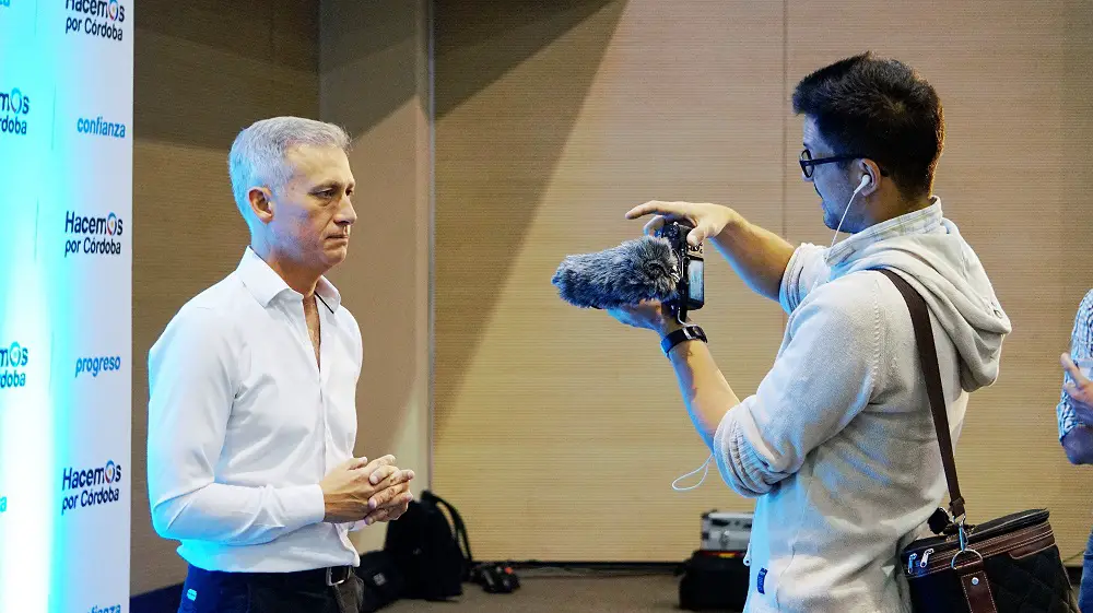 Avilés, en el acto de lanzamiento de Hacemos por Córdoba, entrevistado por periodistas de la capital.