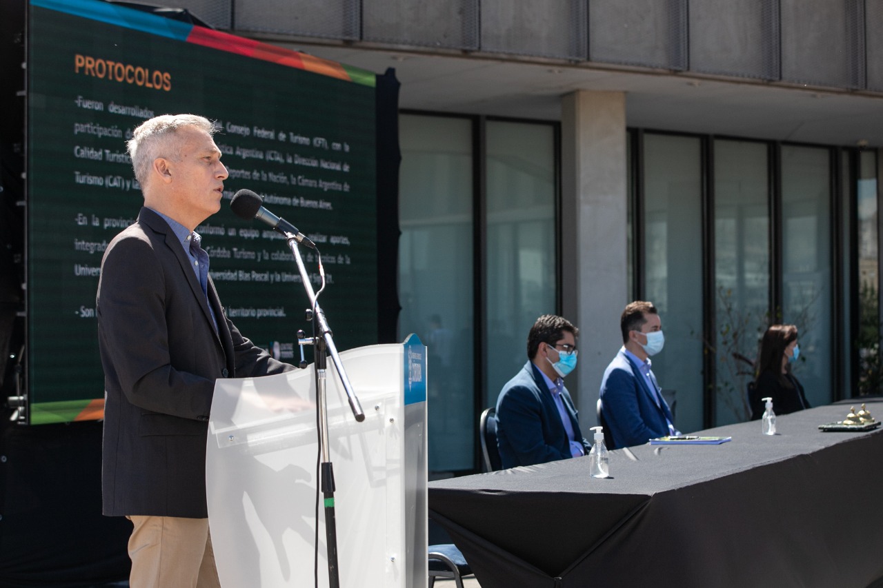 El presidente de la Agencia Córdoba Turismo, Esteban Avilés, fue uno de los oradores del acto en el que el gobernador Juan Schiaretti anunció la apertura de los destinos turístícos de Córdoba que será en forma gradual y cumpliendo protocolos de bioseguridad.