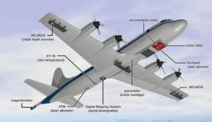 La aeronave de la NASA cuenta con un altímetro láser que mide la altura de la superficie, tres sondas de radar , una cámara de alta resolución para registrar el terreno y una cámara de infrarrojos para medir la temperatura de la superficie. También lleva un gravímetro y magnetómetro que registran pequeñas variaciones en la gravedad de la Tierra y campos magnéticos para medir el espesor de la cavidad oceánica.