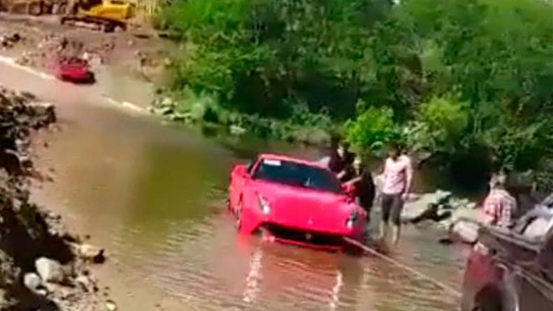 En el video se alcanza a observar a otra Ferrari, una 458 Spider de 500 mil dólares, que no cruzó el vado.