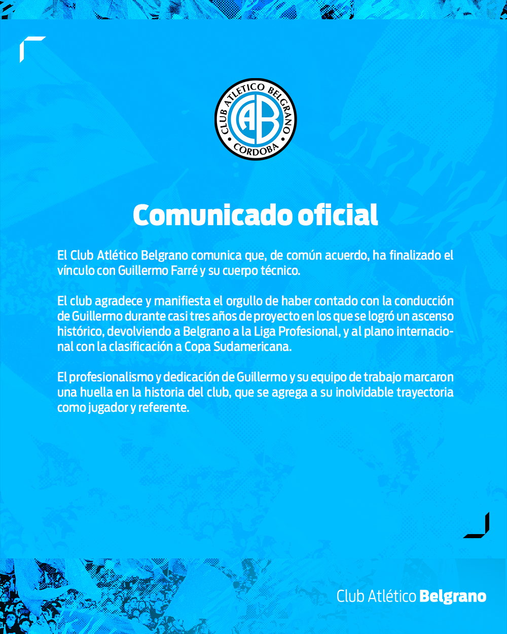 La dimisión de Farré llega en un momento crítico para Belgrano. Desde el inicio de la temporada, el equipo solo ha logrado una victoria y acumula ocho puntos en diez fechas de la Copa de la Liga Profesional. Aunque se especulaba con la posibilidad de que el DT aguante hasta la fecha FIFA, el comunicado del club despidiendo a su entrenador indica que su salida es definitiva.