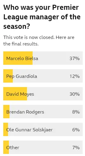Cosechó el 37% de los votos mientras que cerca de él, con el 30%, se ubicó el escocés David Moyes, entrenador de West Ham que terminó sexto y clasificó a la Europa League.
