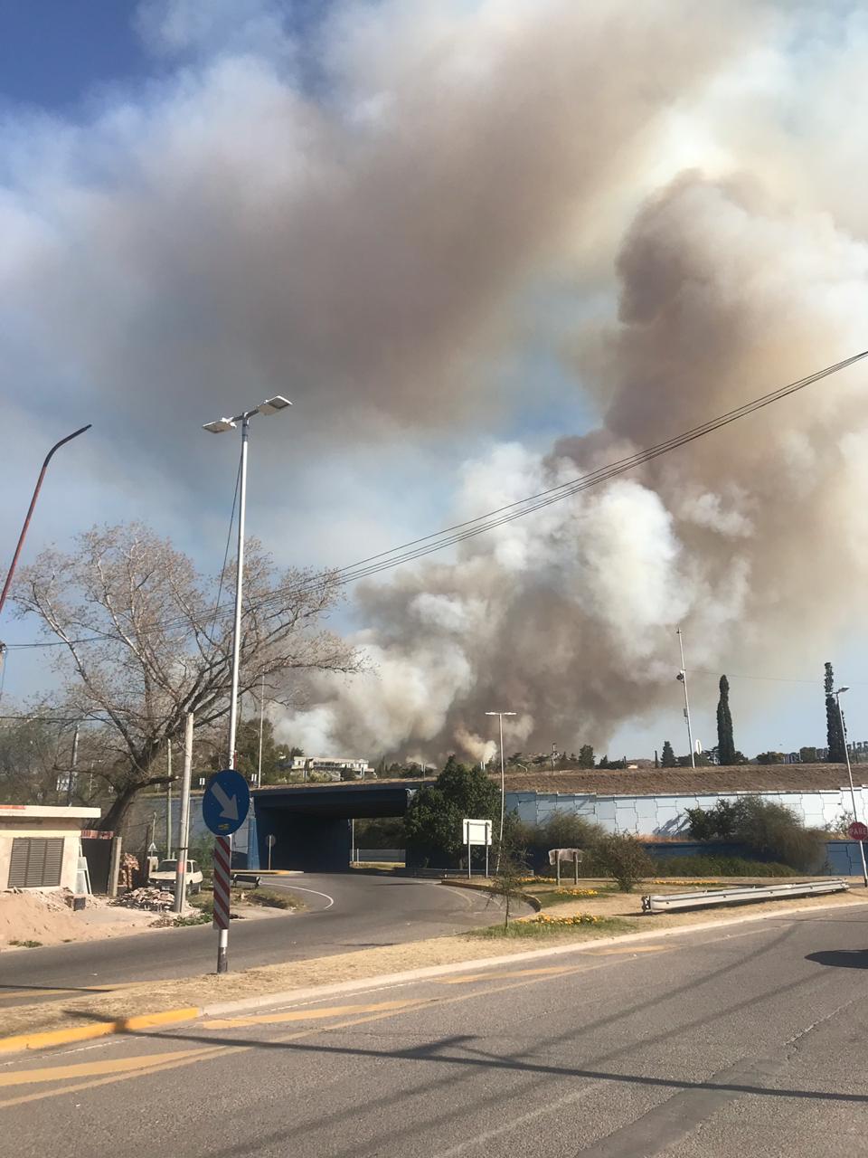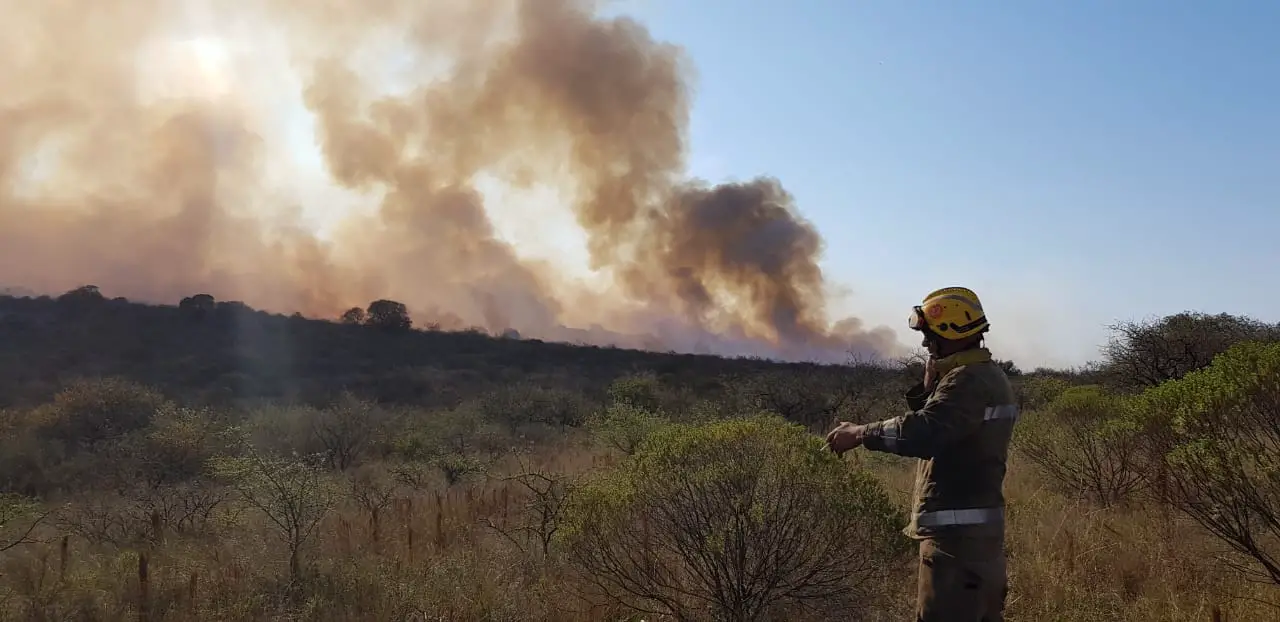 Varias dotaciones de Bomberos Voluntarios combaten este miércoles por la tarde un incendio forestal de magnitud en la zona serrana a la vera de la colectora de la autopista, entre la disco Keops y el country TierrAlta y el Pro Racing.