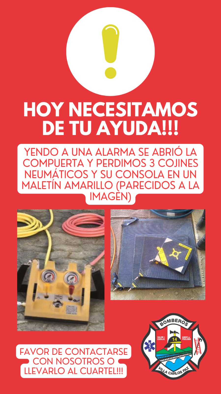 El Cuerpo de Bomberos Voluntarios de Villa Carlos Paz lanzó un pedido urgente a la comunidad para recuperar elementos de rescate que perdieron durante un operativo este sábado.