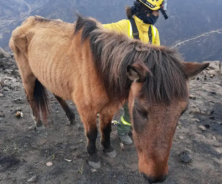 Este domingo, Bomberos Voluntarios de Cosquín tuvieron que rescatar a un caballo que estaba en muy mal estado de salud y con quemaduras, ya que había sido alcanzado por el fuego en el último incendio ocurrido en el cerro Pan de Azúcar.