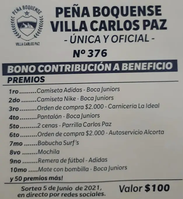 Camisetas y otra indumentaria (de Boca, obvio!), órdenes de compra, pases libres a atracciones locales y muchos otros premios sorteará la Peña Boquense de Villa Carlos Paz, con un valor muy accesible para que puedas comprar tu número, participar y colaborar con la idea de recaudar fondos para las acciones sociales de la entidad.