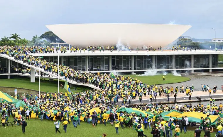 Miles de seguidores del exmandatario de Brasil Jair Bolsonaro, que defienden un golpe de estado para derrocar al presidente Luiz Inácio Lula da Silva, invadieron hoy el Palacio del Planalto, el Congreso Nacional y el Supremo Tribunal Federal (STF, corte suprema), en Brasilia, prácticamente sin resistencia de la policía de la capital federal.