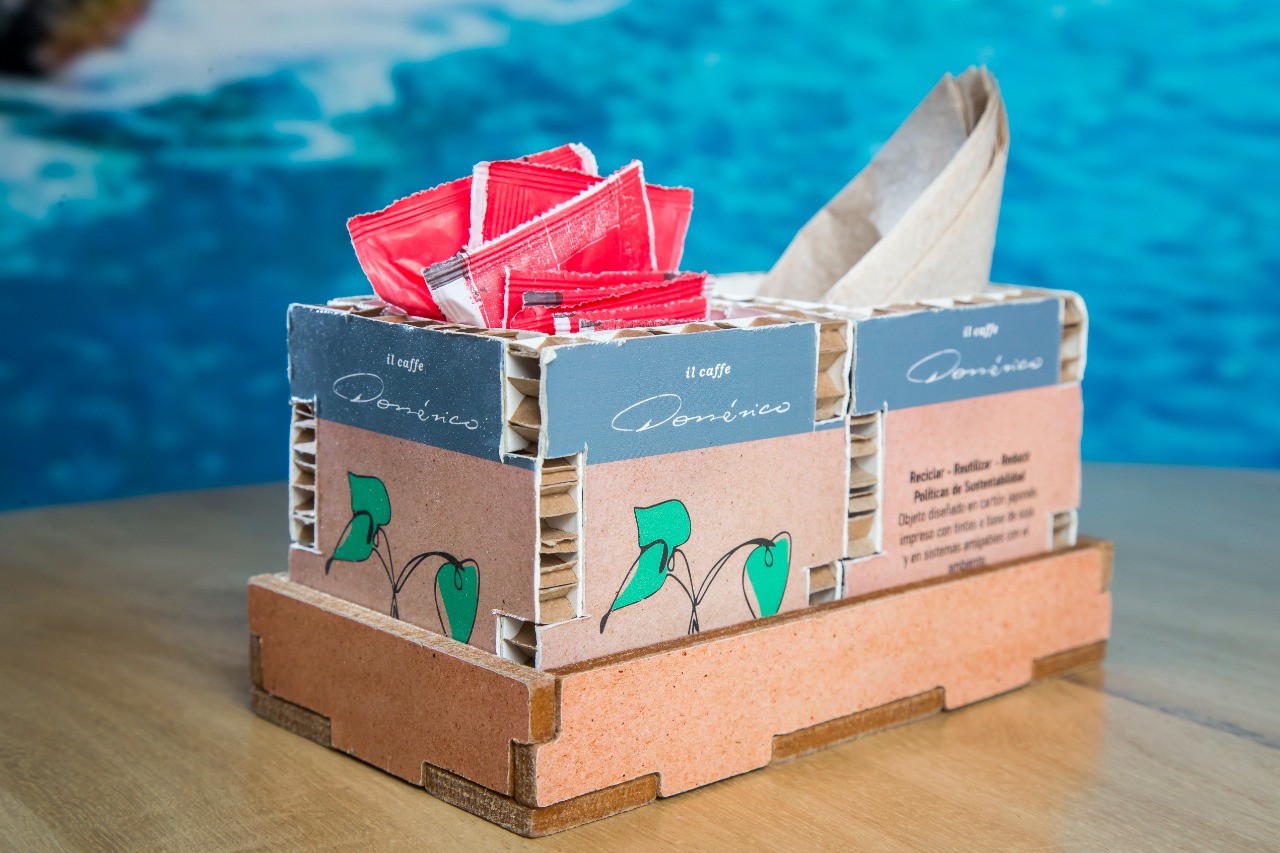 Esta acción, se integra al diseño de accesorios como los objetos funcionales de la mesa, realizado en cartón japonés, impreso en tintas a base de soja y con procesos amigables con el medio ambiente.
