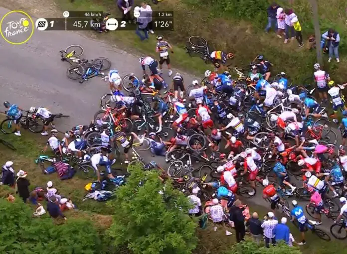Decenas de ciclistas cayeron sobre el asfalto cuando faltaban 45 kilómetros para finalizar la primera etapa la tradicional carrera francesa. ¿El desencadenante? Una espectadora se metió en el recorrido de los deportistas y golpeó con una pancarta a Tony Martin, el primero que cayó.