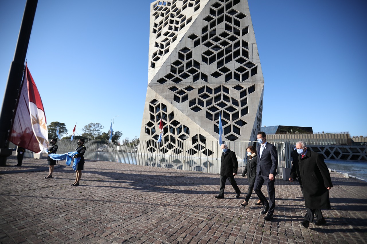 La ceremonia de izamiento del Pabellón Nacional se desarrolló en la explanada del Centro Cívico del Bicentenario de la ciudad de Córdoba, cumpliendo los protocolos sanitarios vigentes por la pandemia de coronavirus.
