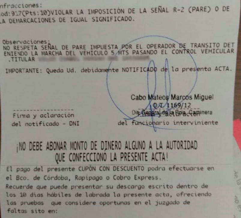 En definitiva, esa supuesta violación al control de la Caminera fue por frenar unos centímetros después que el bastón naranja que manipulan los oficiales.