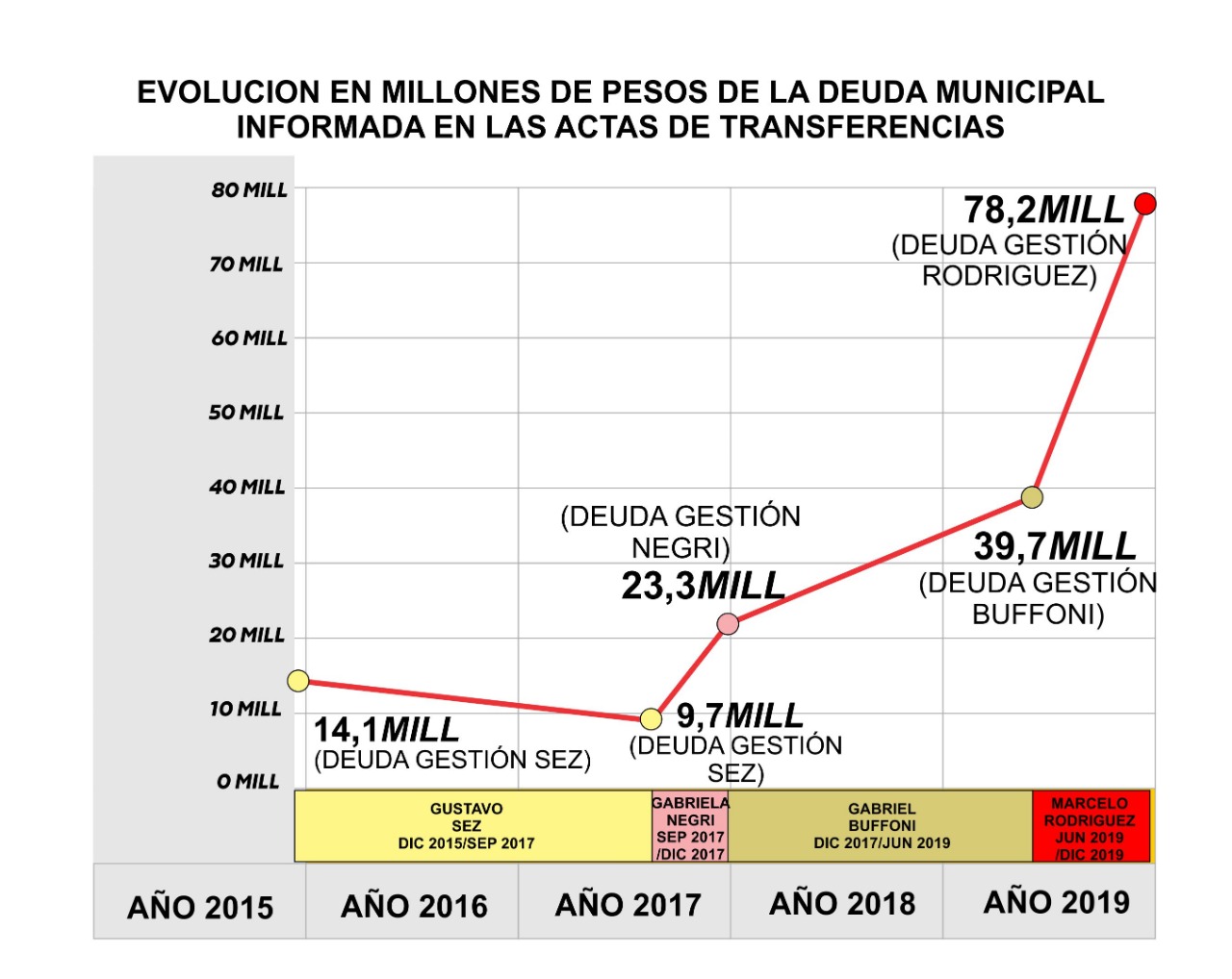 Y explicó: «Se toma como referencia el período anterior (2015/2019), con una deuda informada por el exintendente Gustavo Sez, al momento de su renuncia, en septiembre de 2017, que ascendía a los $9.737.648; y un total informado de $78.271.788 por el ex Intendente Interino Marcelo Rodríguez en diciembre 2019, al momento de completar el mandato del renunciante Gabriel Buffoni».