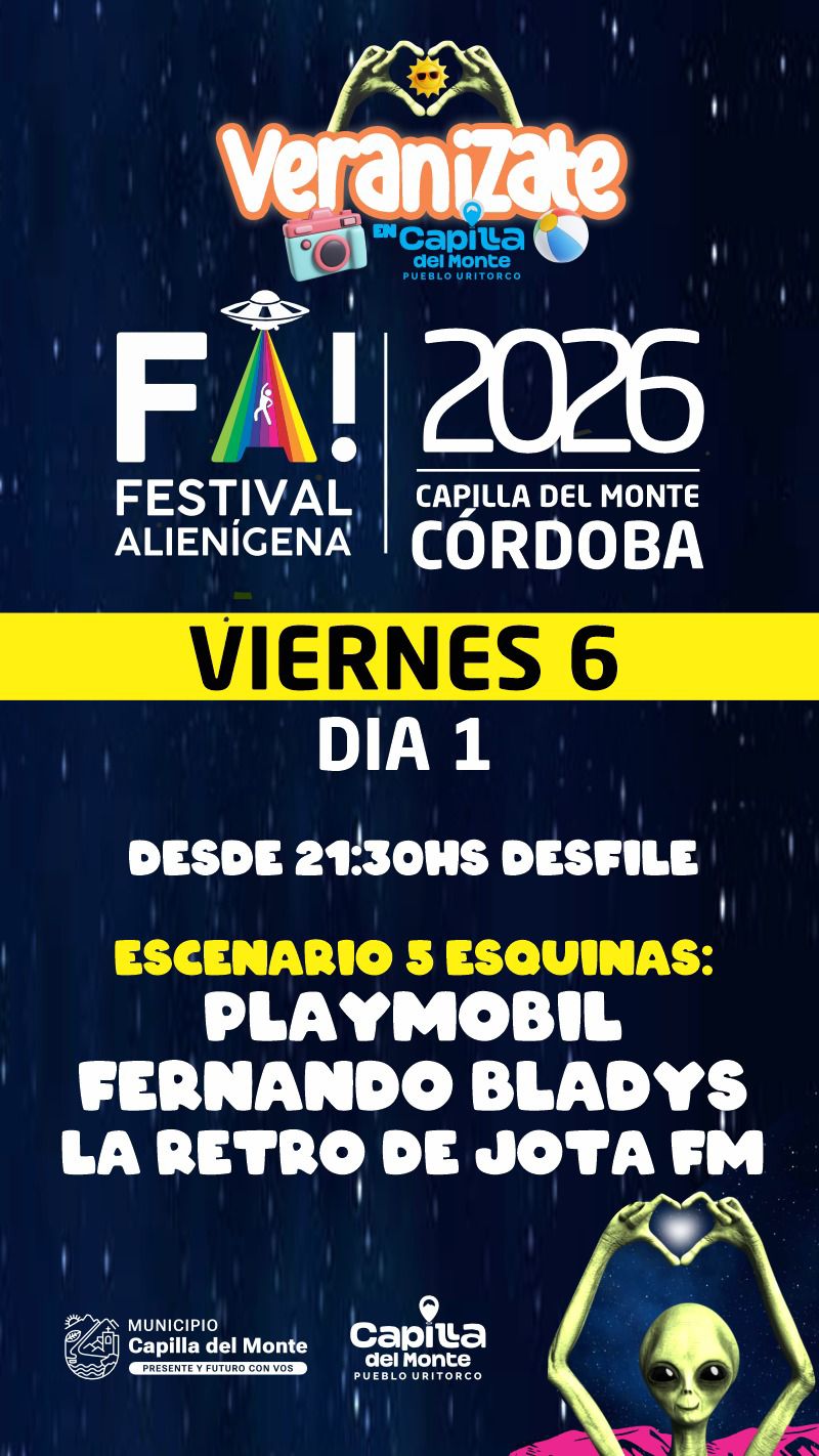 Viernes 6 (Apertura): El clásico Desfile Alienígena largará a las 21:30 h en el Escenario de las 5 Esquinas. La noche se encenderá con el ritmo de PLAYMOBIL y un cierre de lujo con Fernando Bladys.
