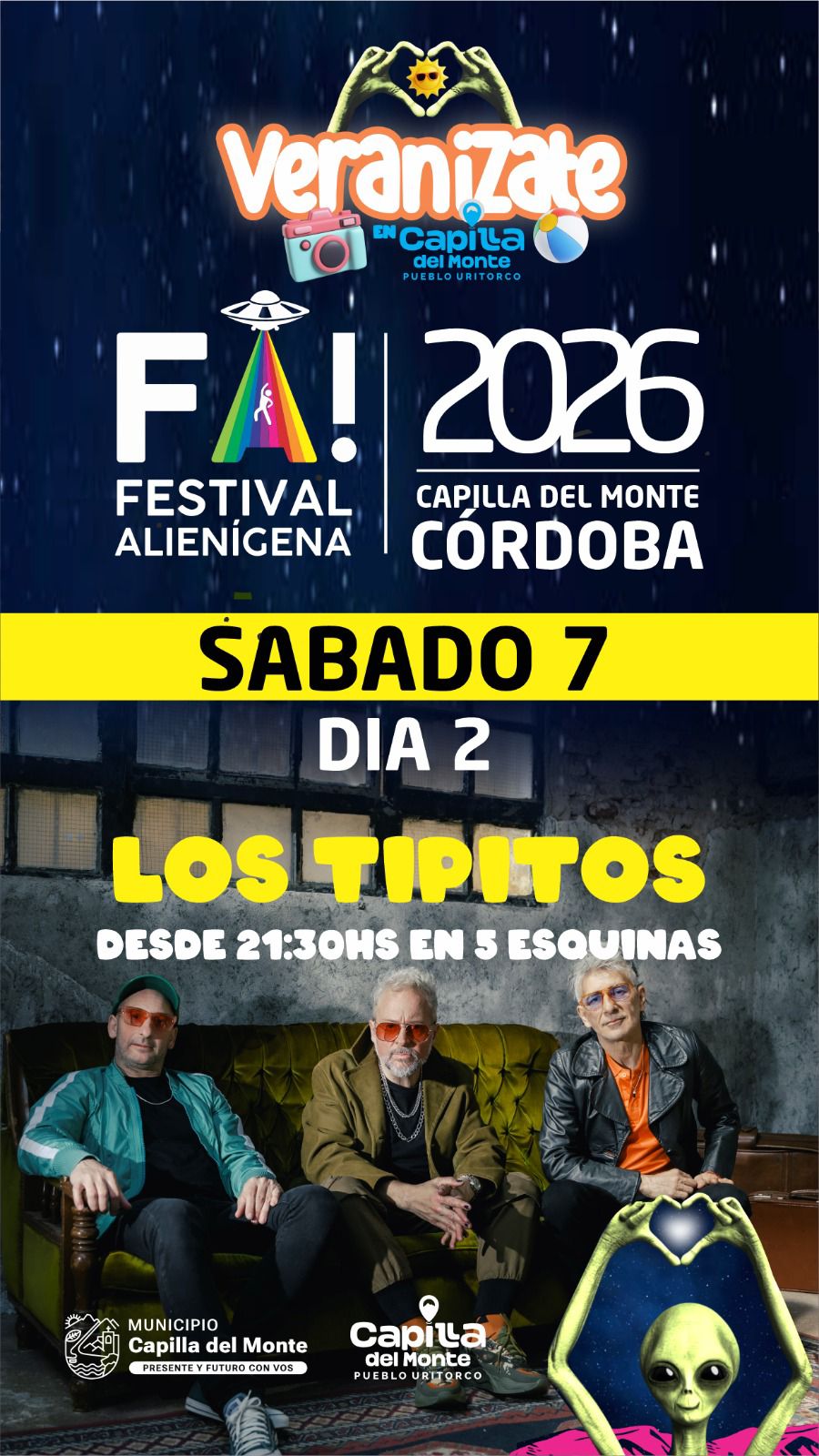 Sábado 7 (Noche de Rock): Tras la premiación del concurso de disfraces, la música tomará el control con Nawan, Marcianos (tributo a Enanitos Verdes) y el gran show de Los Tipitos.