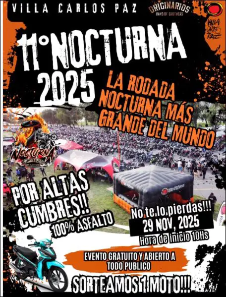 Villa Carlos Paz será nuevamente epicentro de uno de los eventos motociclistas más convocantes del país. Este sábado 29 de noviembre, el colectivo ORIGINARIOS Band of Brothers realizará la 11° Rodada Nocturna, una experiencia que desde hace más de cuatro años recorre las sierras de Córdoba con una organización cada año más multitudinaria.