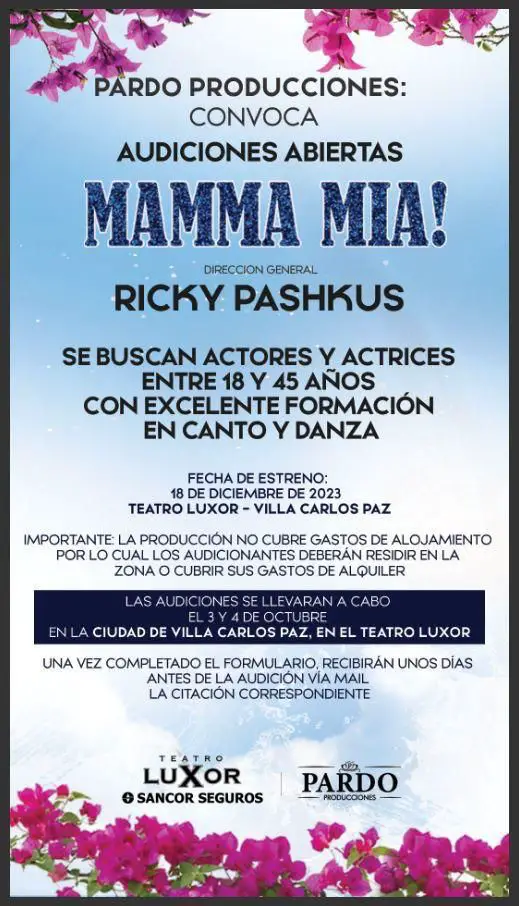 Pardo Producciones convoca a audiciones abiertas para participar de la comedia musical más exitosa de todos los tiempos, «Mamma mía», este el 3 y 4 de octubre en el Teatro Luxor de Villa Carlos Paz.