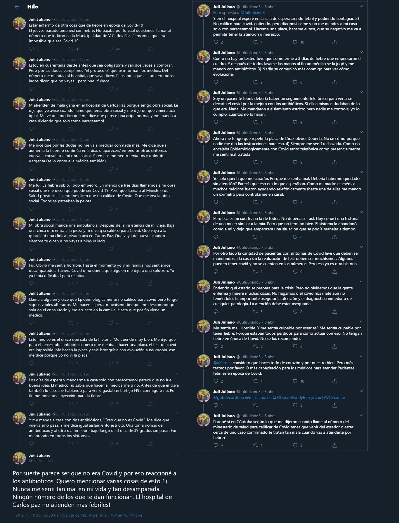 Este jueves, Julieta Juliano, una joven de Villa Carlos Paz, denunció mediante su cuenta de Twitter que: entre el Ministerio de Salud, el Hospital de Villa Carlos Paz, la Obra Social, la tuvieron varios días sin respuesta hasta que logró dar con un médico que la atendió correctamente.
