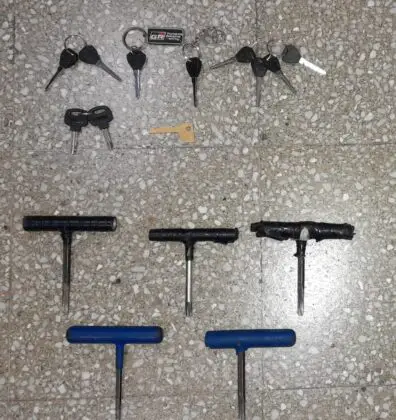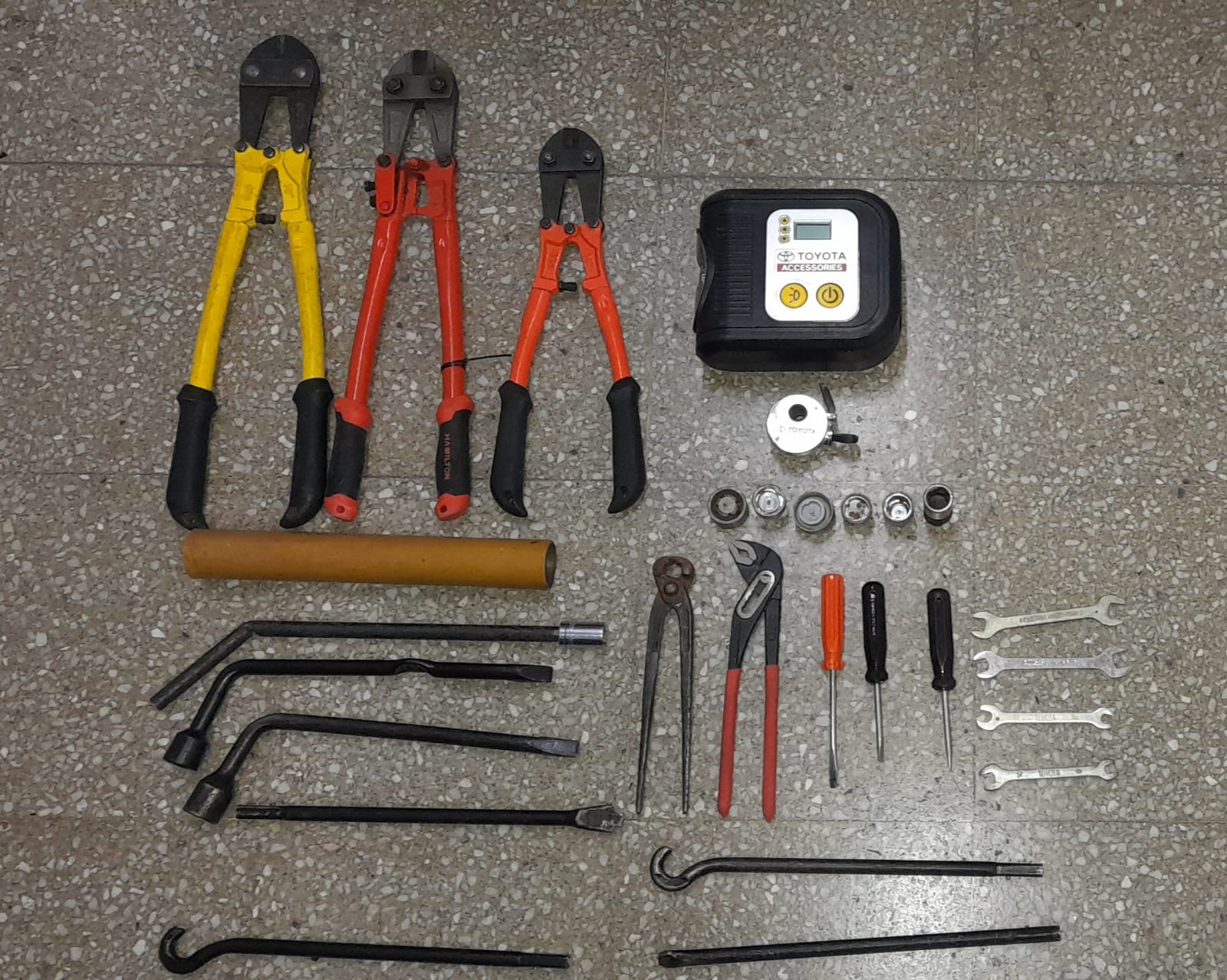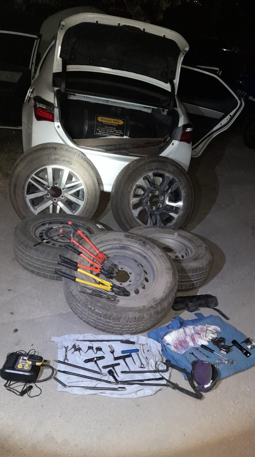En el lugar también secuestraron un celular, cinco ruedas de auxilios, tres cortapernos, cinco ganzúas, diez llaves falsas, siete llaves saca bulones, una riñonera con dinero en efectivo, un reloj pulsera, tres linternas, un cargador de cartuchos de escopetas, un cargador de celular, un inflador de cubiertas, seis tuercas antirrobo y herramientas de mano.