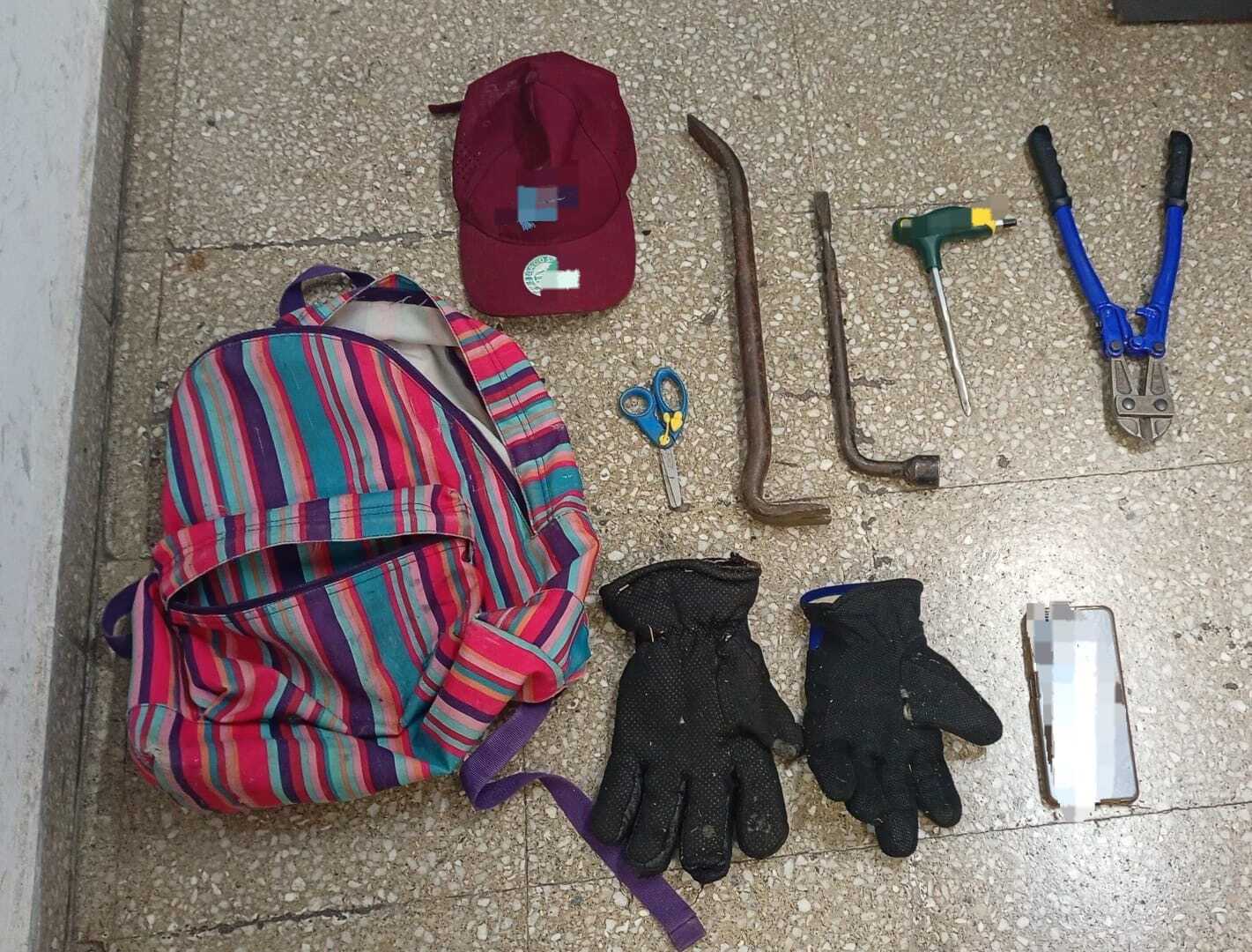 Uno de los jóvenes llevaba una mochila con una pinza corta, un perno con llave tipo «T» y una palanca, objetos que parecen estar relacionados con las prácticas delictivas.
