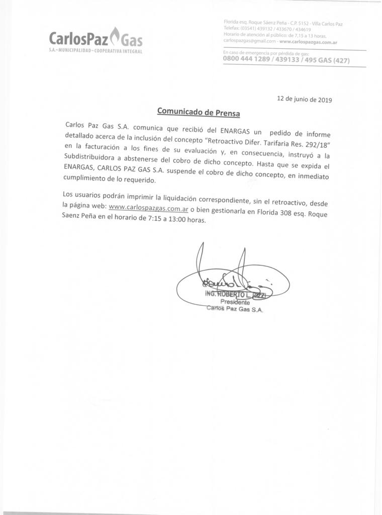 En un comunicado emitido en el mediodía de este miércoles, los directivos de Carlos Paz Gas de la parte municipal informaron que se acatará el pedido del Ente Nacional Regulador de Gas (Enargas) y se dejará en suspenso el cobro del retroactivo por el incremento en la tarifa no cobrado a los usuarios de la ciudad.