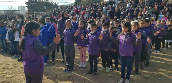 Los alumnos de cuarto grado de distitas instituciones la ciudad esperan para hacer la promesa de lealtad a la bandera nacional.