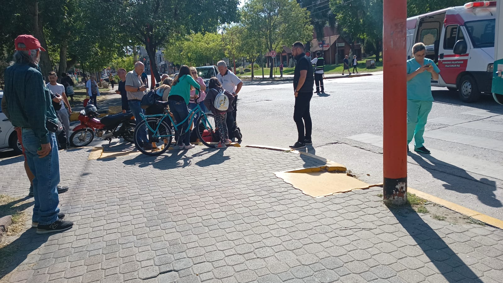 En pleno centro de Villa Carlos Paz, una mujer perdió el control de su motocicleta y chocó una camioneta; por sus lesiones fue traslada al Hospital Municipal Gurmersindo Sayago.