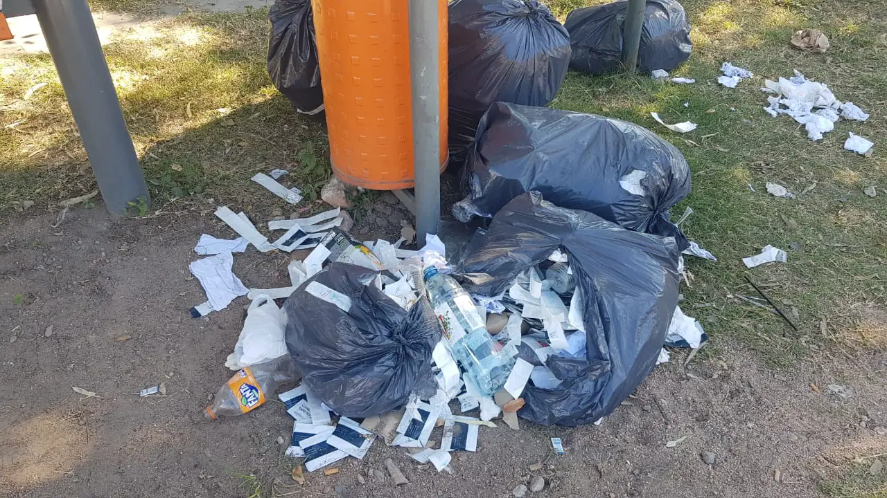 Este miércoles a la mañana, vecinos y personas que llegaron para realizarse el hisopado en las instalaciones del CEDER, ubicado en avenida Cárcano y Carlos Gardel, se encontraron con varias bolsas de residuos dañadas y el contenido estaba desparramado en la vereda y la calle. Eso de por sí es antihigiénico debido a que están al alcance de animales callejeros que rompen la basura en busca de comida.