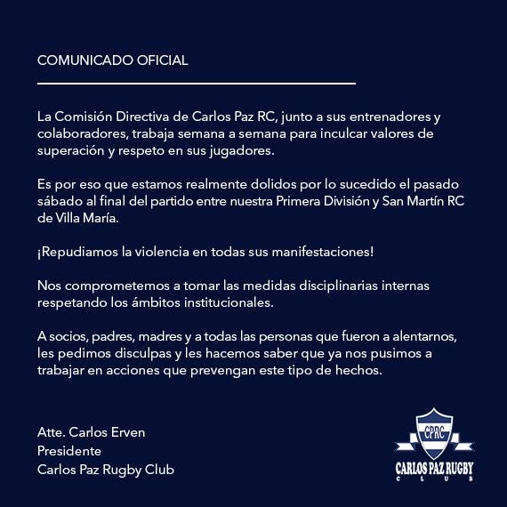 Desde la Comisión Directiva del Carlos Paz se mostraron “dolidos por lo sucedido”, repudiando el acto de violencia del último sábado y además declararon su compromiso para “tomar las medidas disciplinarias internas respetando los ámbitos institucionales”.