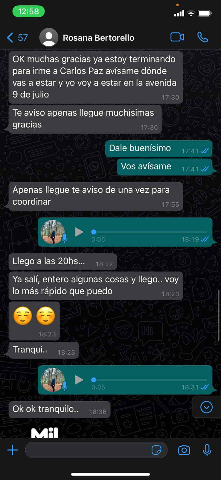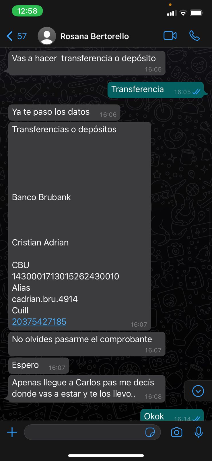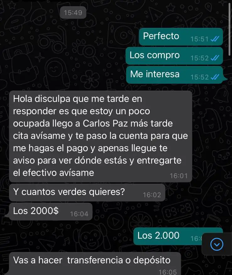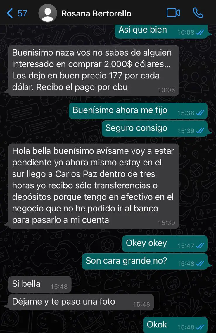 En dialogo con Carlos Paz Vivo!, el joven contó cómo fue la estafa: «Me mandaron un Whatsapp de un número diciendo que era Rosana Bertorello, la mamá de una amiga, diciendo que cambió su número y que actualice su contacto. El tema es que después me ofreció dos mil dólares que tenía para vender y, como yo se comprar y vender teléfonos que se pagan en dólares, conozco a gente que suele buscar dólares para comprar; entonces, para hacerle la onda a ella, conseguí un comprador».