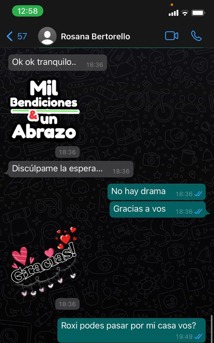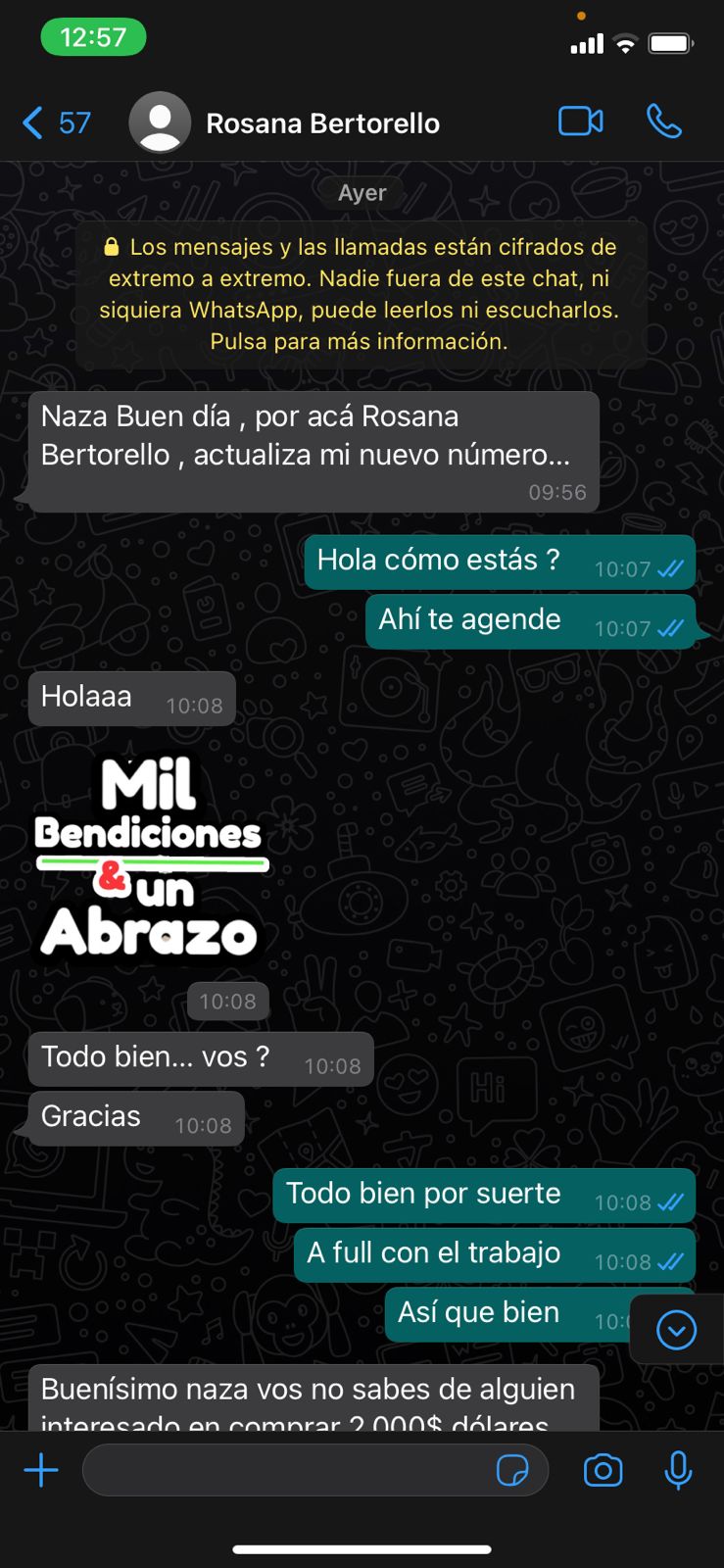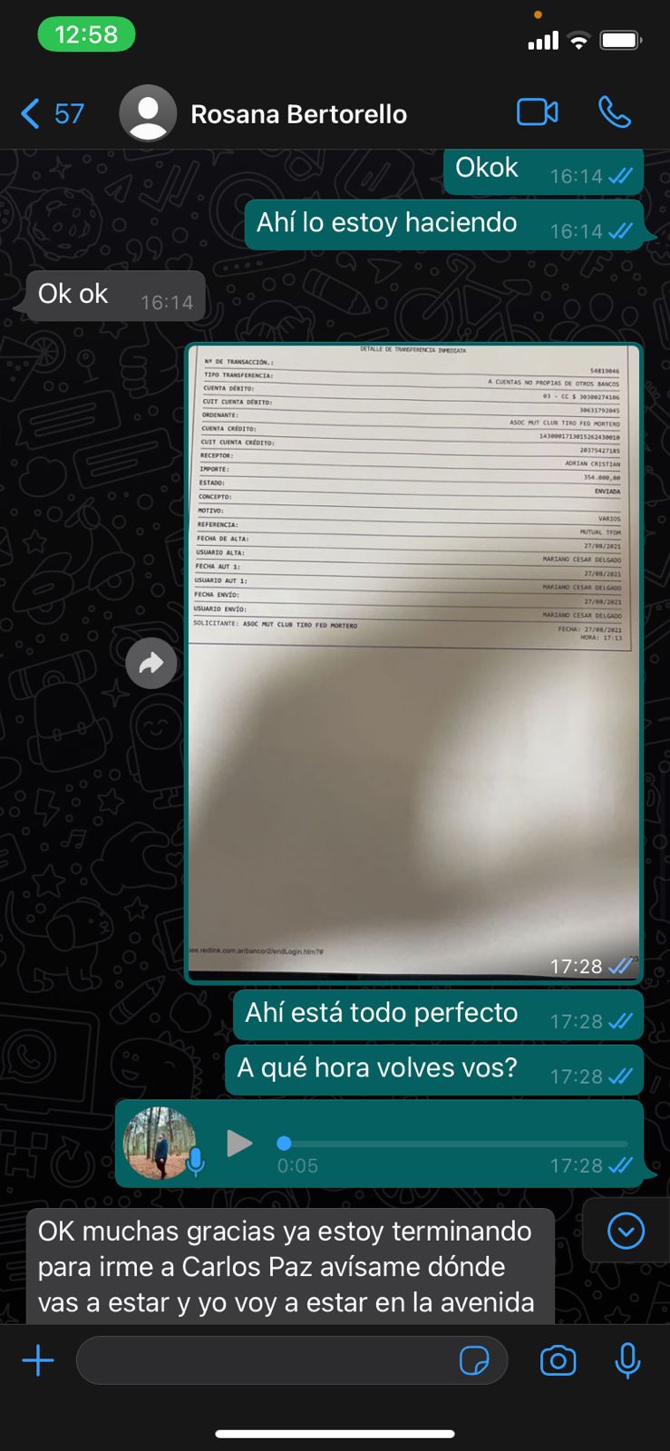 En dialogo con Carlos Paz Vivo!, el joven contó cómo fue la estafa: «Me mandaron un Whatsapp de un número diciendo que era Rosana Bertorello, la mamá de una amiga, diciendo que cambió su número y que actualice su contacto. El tema es que después me ofreció dos mil dólares que tenía para vender y, como yo se comprar y vender teléfonos que se pagan en dólares, conozco a gente que suele buscar dólares para comprar; entonces, para hacerle la onda a ella, conseguí un comprador».