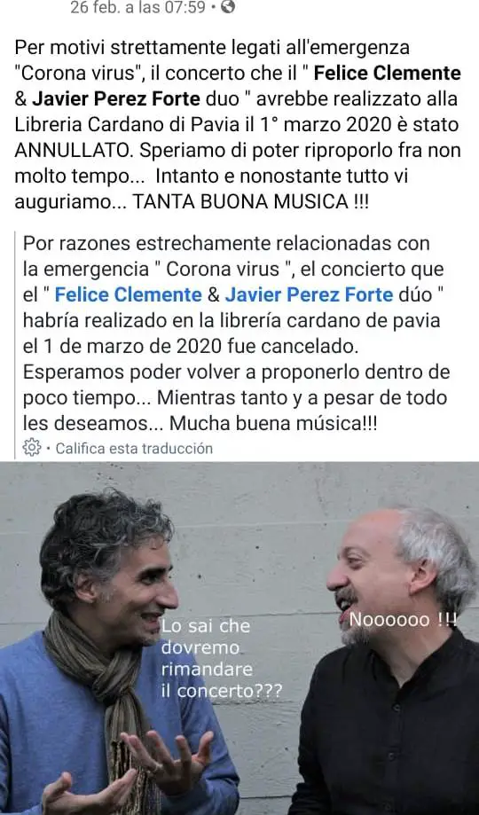 Perez Forte, hoy reside en Casorate y tiene su escuela de música en Gallarate a pocos kilómetros al noreste de Milano, todo en la región de Lombardía. Esta zona, se encuentra a tan sólo unos 70 km de Codogno, en Lodi donde se dio el brote inicial del Coronavirus. En dicha región, se han infectado 2 mil de los 3mil enfermos detectados en Italia.