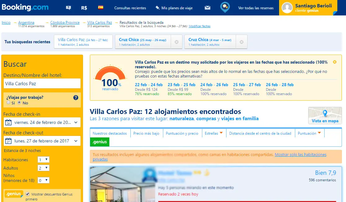 La página de reservas on-line Booking.com, una de las más grandes y consultadas del mundo, no tiene más alojamientos disponibles para Carlos Paz en el fin de semana de Carnaval, algo que no es habitual.