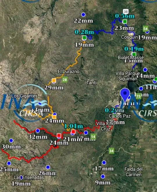 A raíz de esas precipitaciones llegó durante la mañana una creciente de 1 metro a la altura de Cuesta Blanca, que sería luego algo menor en la medición de Carlos Paz.