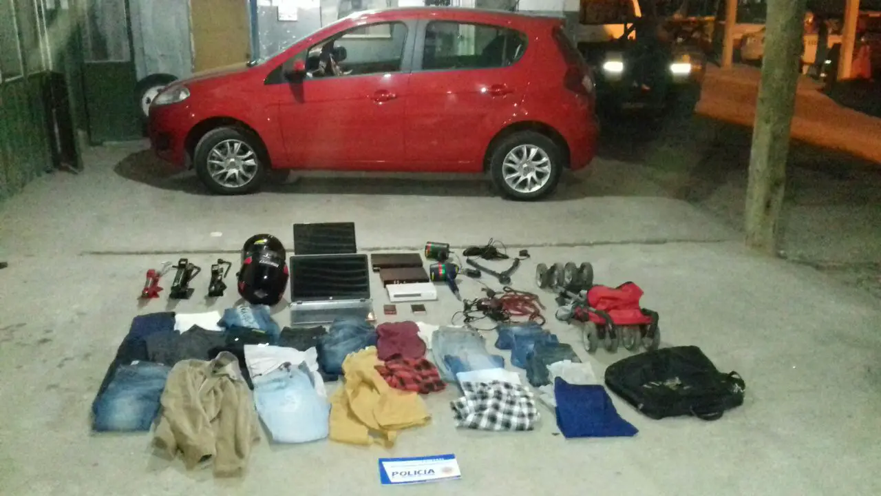 Por tal motivo, los agentes montaron un operativo para encontrar el vehículo, y en calles Mozart y avenida San Martín, lograron dar con el rodado, de donde incautaron una pinza corta perno, 10 pantalones de jean, 3 gatos tijeras, 2 notebooks, 2 cascos de motocicletas, y 2 reflectores.