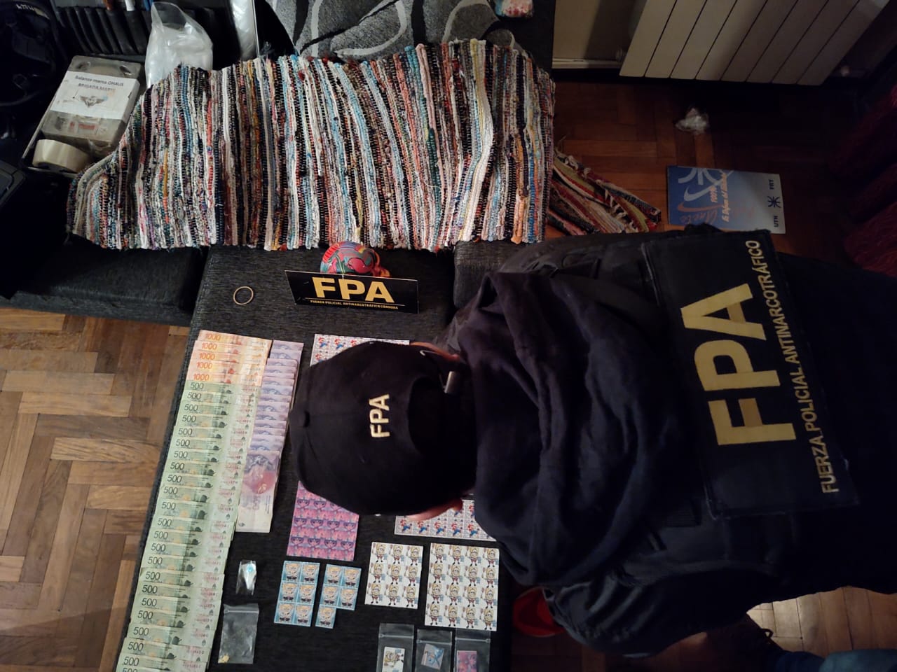 Inmediatamente procedieron al allanamiento de su departamento ubicado en calle Independencia al 800. En el inmueble y con intensos registros por parte de los efectivos, incautaron 4.450 troqueles de LSD, varias dosis de cocaína y marihuana, dinero, una pastilla de éxtasis y elementos probatorios.