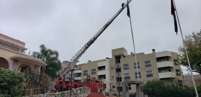 “Alta en el cielo”; pero atascada, no hubo forma de poder bajarla de manera habitual, por lo que una dotación de Bomberos Voluntarios tuvo que asistir con la unidad pesada que contiene la escalera hidráulica para poder destrabarla y que siga flameando como corresponde.