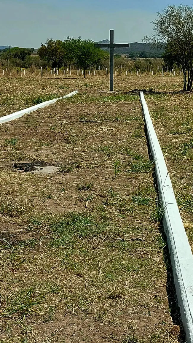 Veo el muro blanquito, a la cal, prolijito, con una cruz muda encima. Veo también un camino largo que no baja y que se pierde en el suelo desmontado… y que termina en otra cruz.