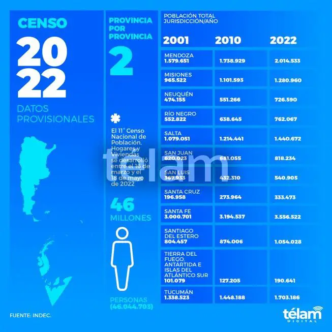 La población de Argentina es de 46.044.703 personas, lo que representa un crecimiento del 14,77% en relación con 2010, cuando se habían reportado un total de 40.117.096 habitantes, de acuerdo con los resultados provisorios del Censo 2022 difundidos esta tarde por el Instituto Nacional de Estadística y Censos (Indec).
