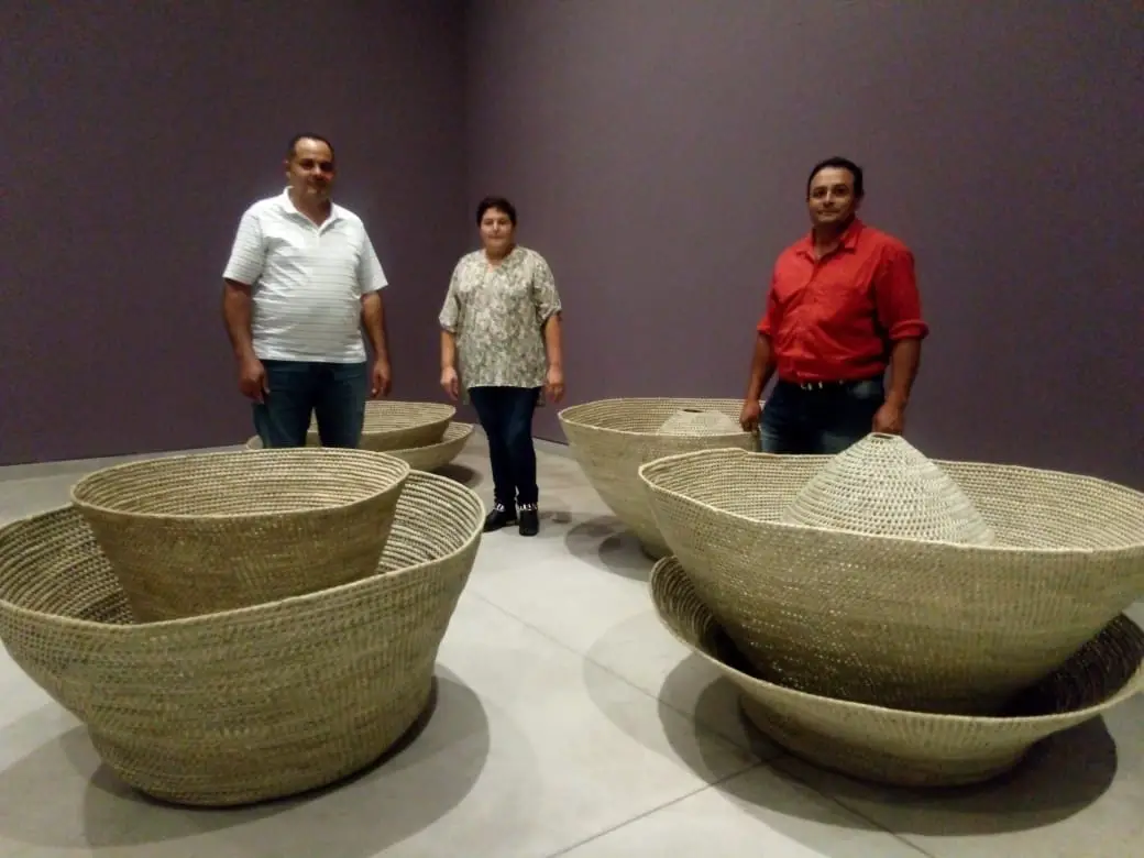 tejieron los objetos, ofrecieron un taller abierto a artistas y estudiantes de arte interesados en el trabajo con fibras vegetales. Se realizó en el Museo Caraffa (que ellos visitaban por primera vez), y explicaron las formas tradicionales de recolección, sCestería en palma de Caranday, de la artesanía funcional al arte contemporáneocado y preparación de hojas de palma Caranday. La charla continuó con algunas pautas iniciales de tejido a los asistentes del taller, que salieron fascinados con la experiencia.