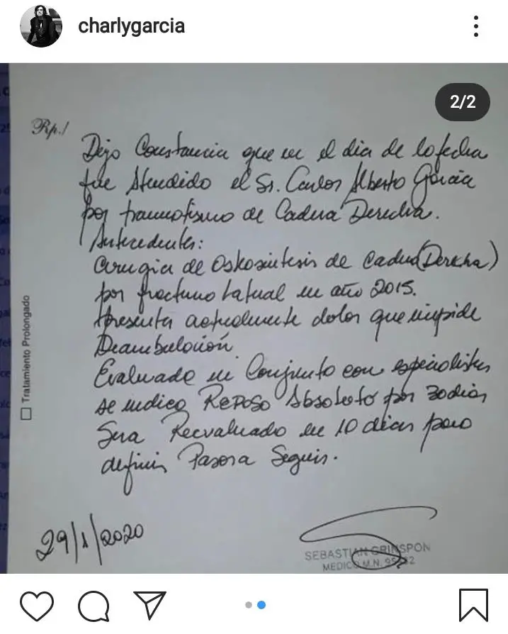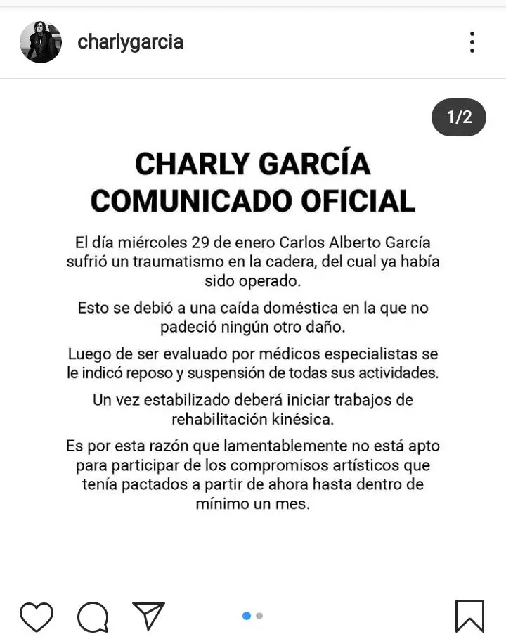 Charly García habría sufrido un accidente doméstico que le ocasionó un traumatismo en la cadera, del cual ya había sido operado. Los médicos consideraron que no se encuentra apto para participar de los próximos eventos que tenía previstos, entre ellos el Cosquín Rock, donde se iba a presentar el próximo 8 de febrero.