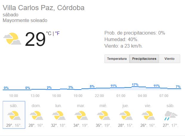 Para este sábado, se estima un día algunas nubes, relativamente bajo porcentaje de humedad y una temperatura máxima de 29 grados.