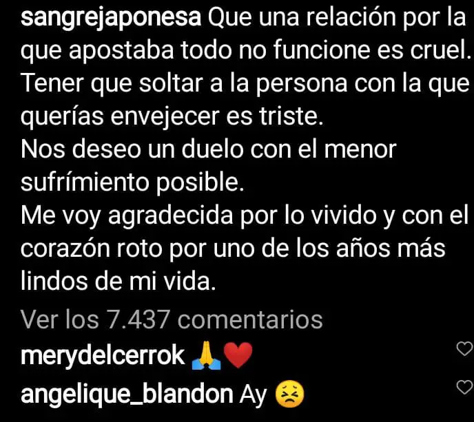 “Que una relación por la que apostaba todo no funcione es cruel. Tener que soltar a la persona con la que querías envejecer es triste. Nos deseo un duelo con el mejor sufrimiento posible. Me voy agradecida por lo vivido y con el corazón roto por uno de los años mas lindos de mi vida”, publico Eugenia.