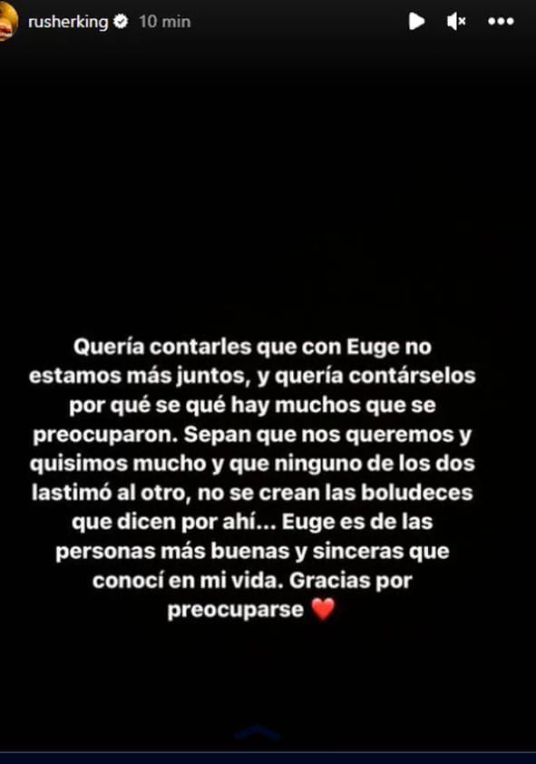“Quería contarles que con Euge no estamos más juntos, y quería contárselos porque se que hay muchos que se preocuparon. Sepan que nos queremos y nos quisimos muchísimo y que ninguno de los dos lastimó a otro, no se crean las boludeces que dicen por ahí. Euge es de las personas mas buenas y sinceras que conocí en mi vida. Gracias por preocuparse, escribió Rusherking en una historia en su red social.