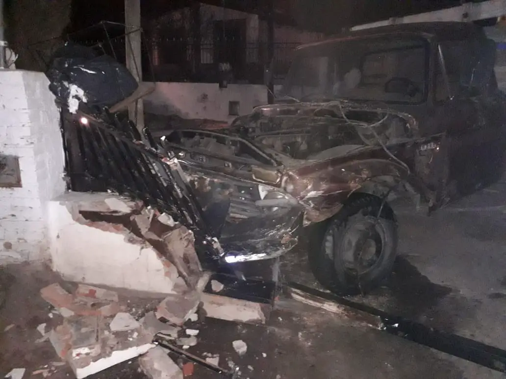 Según muestras las imágenes, el impacto fue tal que produjo que el vehículo de mayor porte se deslizara y terminara impactando contra las rejas de una vivienda, ocasionándole importantes daños a la propiedad y al camión.