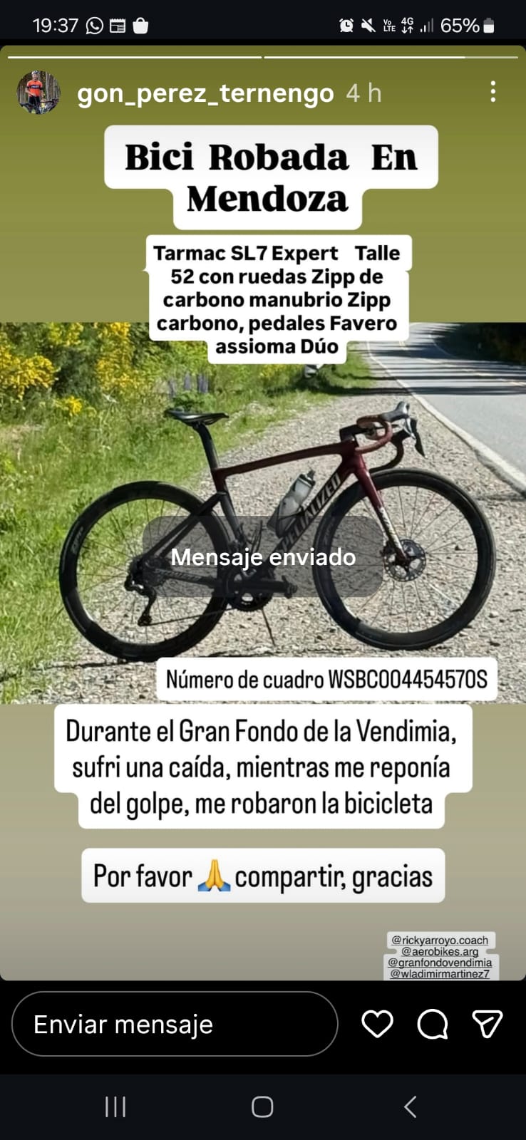“Fui a correr la carrera del Gran Fondo de la Vendimia que es una carrera de ruta. En un momento me caigo en la ruta y choco contra un auto. Cuando me estaba atendiendo el dueño del auto con los médicos me robaron la bicicleta”, sostuvo Gonzalo.