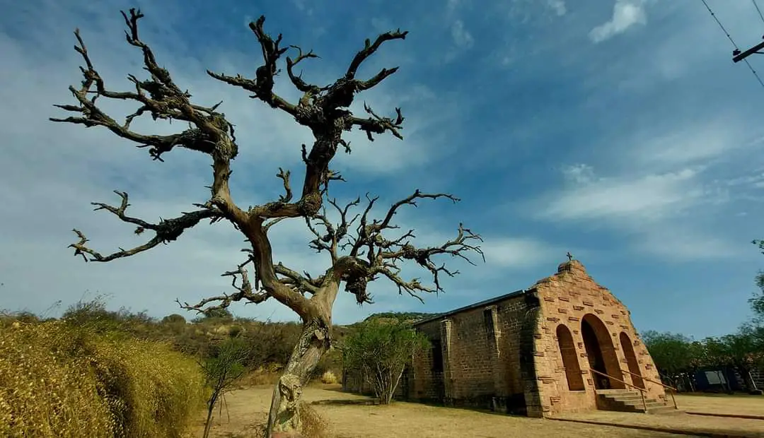 Aquí está la Capilla de Cerro Colorado, de reciente construcción pero con un estilo cuidado, ajustado al entorno… y el viejo algarrobo muerto, con el homenaje al Indio Pachi, el que le dijo a Yupanqui: