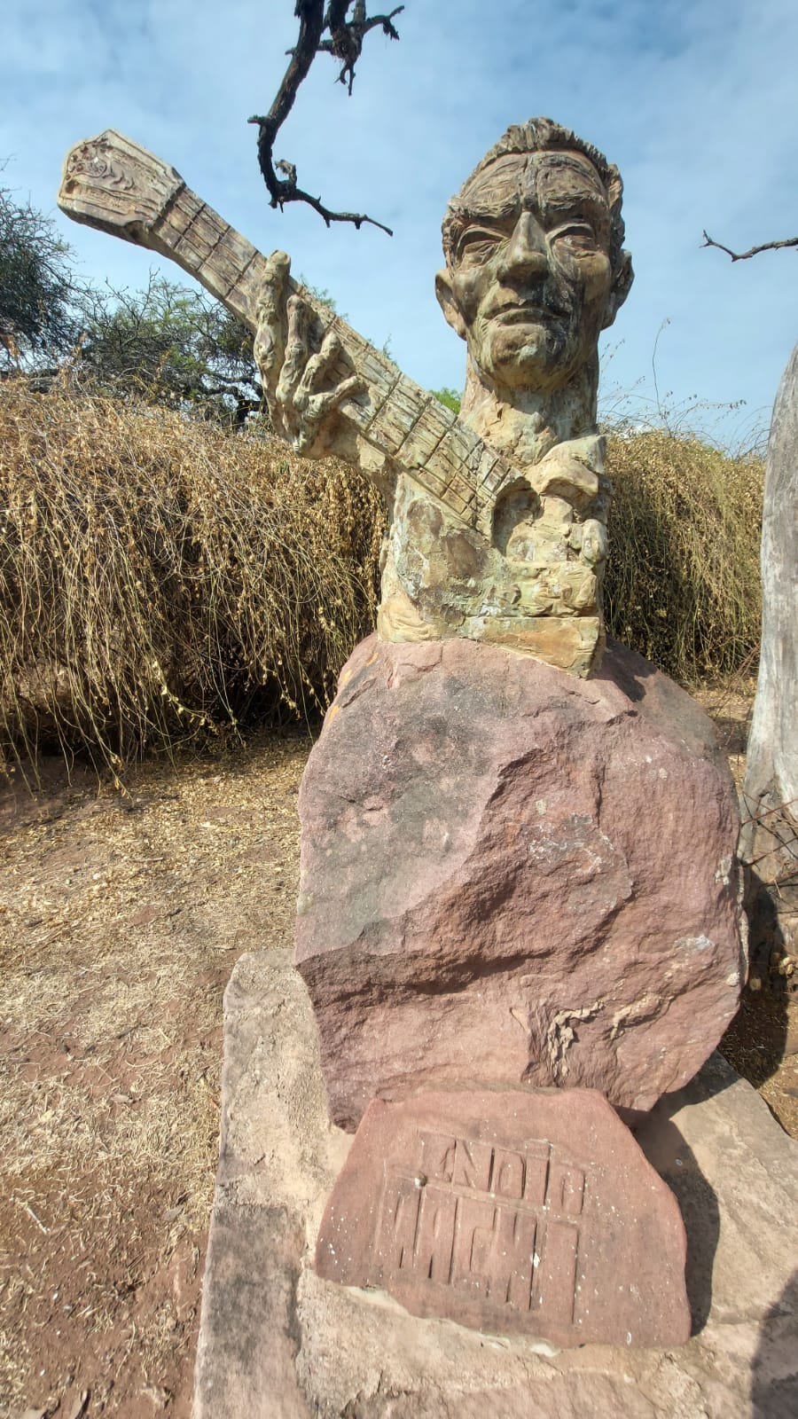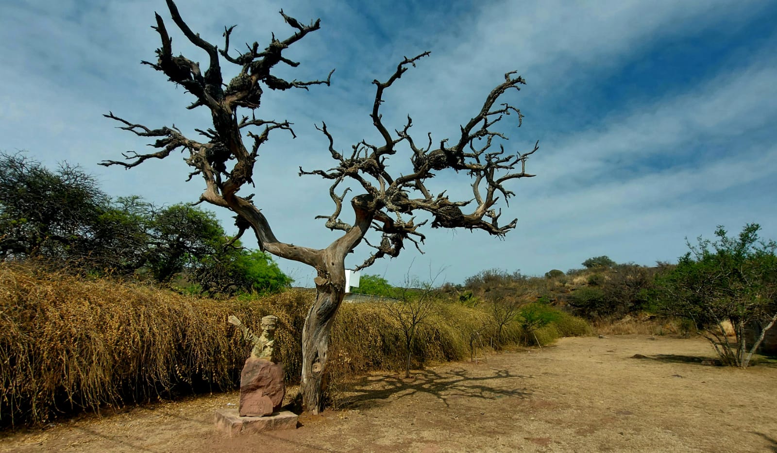 Pachi se evoca allí, en piedra, bajo la cadavérica sombra de ese algarrobo.