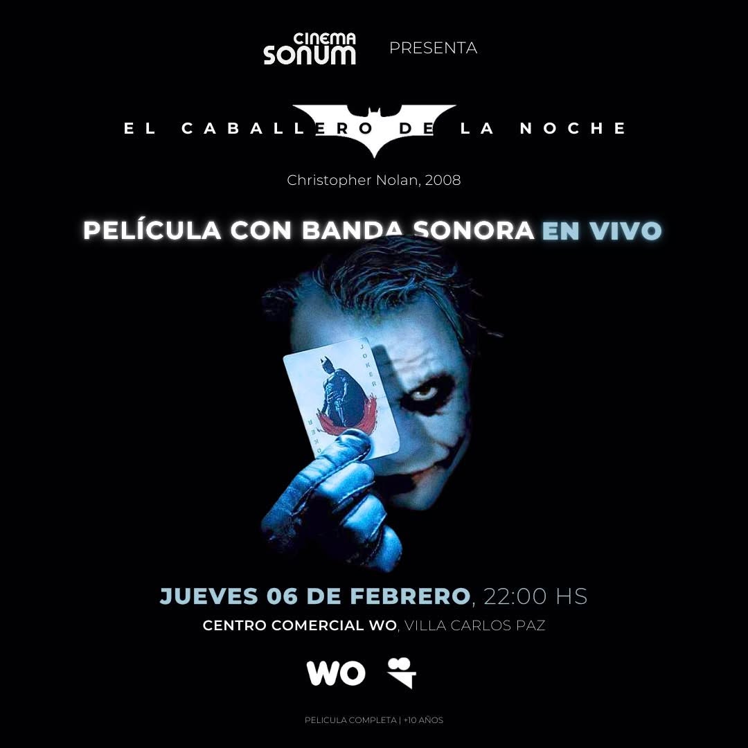 El próximo jueves 6 de febrero a las 22:00, el Centro Comercial WO de Carlos Paz será escenario de una propuesta única que promete deleitar a cinéfilos y amantes de la música en vivo. Se trata de la proyección de la icónica película “El Caballero de la Noche”, dirigida por Christopher Nolan, en un formato inmersivo que eleva la experiencia cinematográfica al máximo nivel.